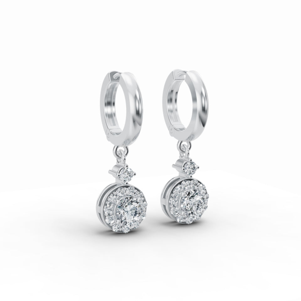 These elegant drop earrings feature a solitaire diamond at the center, encircled by a sparkling halo of smaller stones for added brilliance. Perfect for both special occasions and everyday sophistication, these earrings add effortless sparkle to any ensemble.